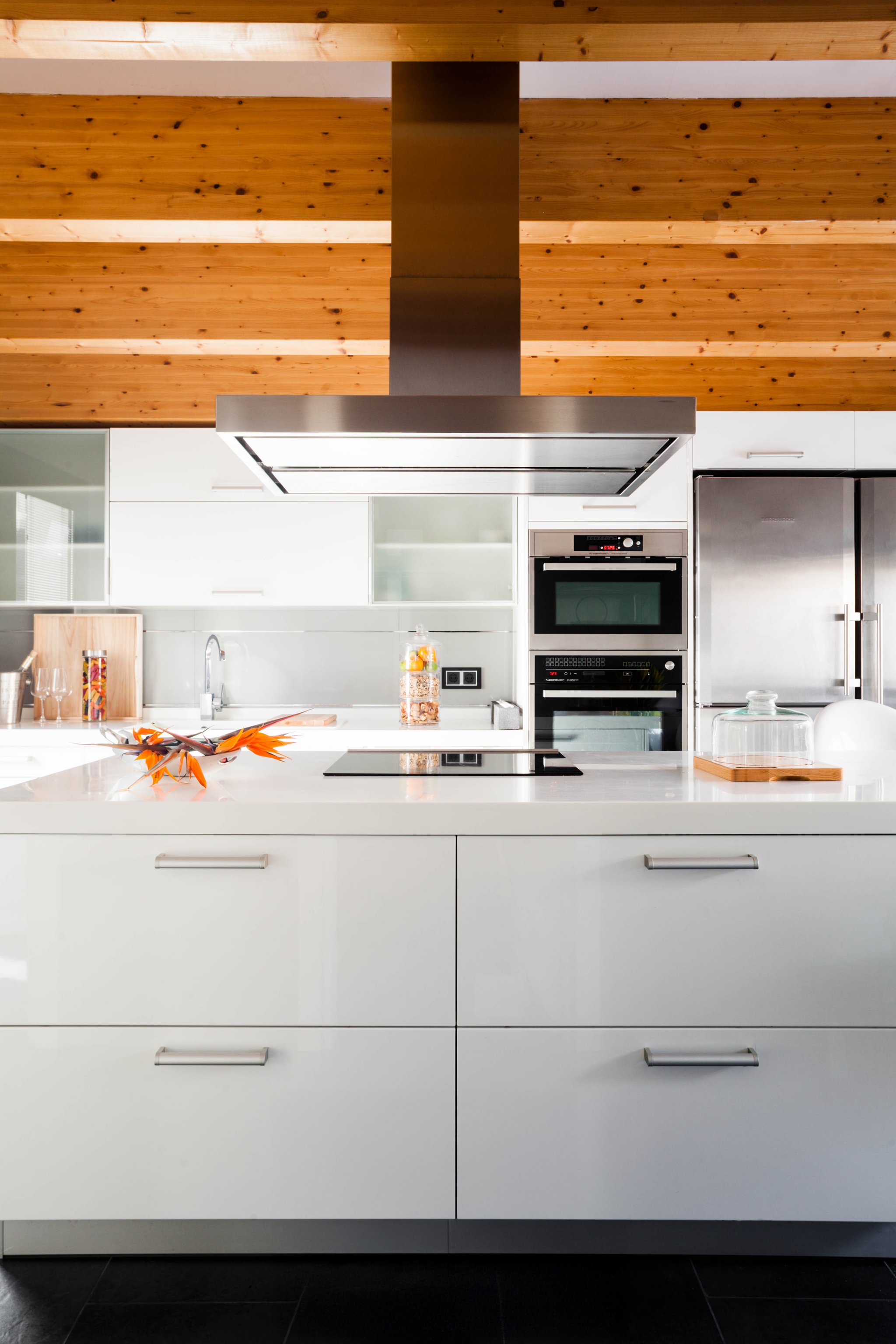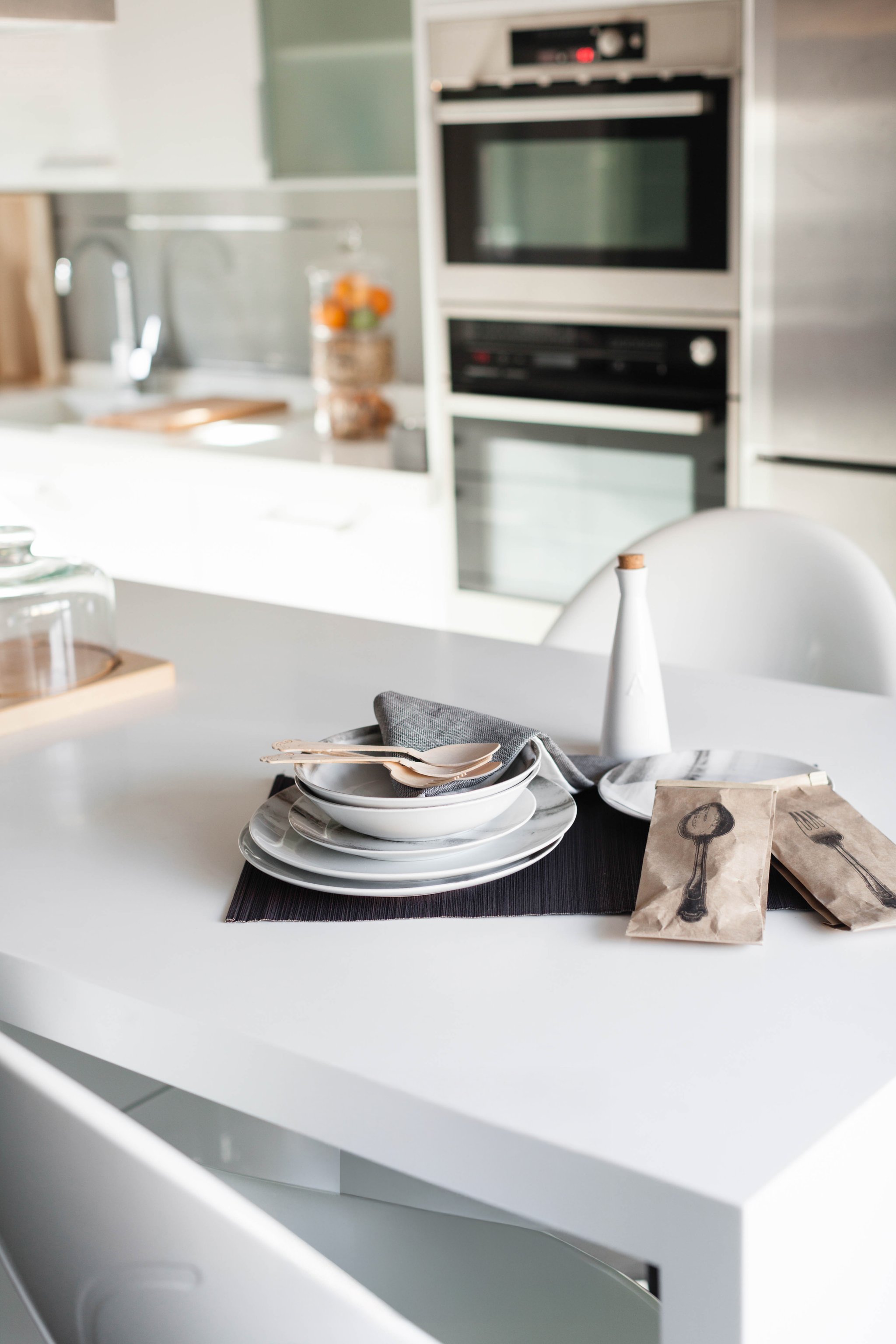 Cocina con isla central, líneas limpias y materiales puros. Un espacio pensado para cocinar, compartir y habitar desde la calma y el orden.