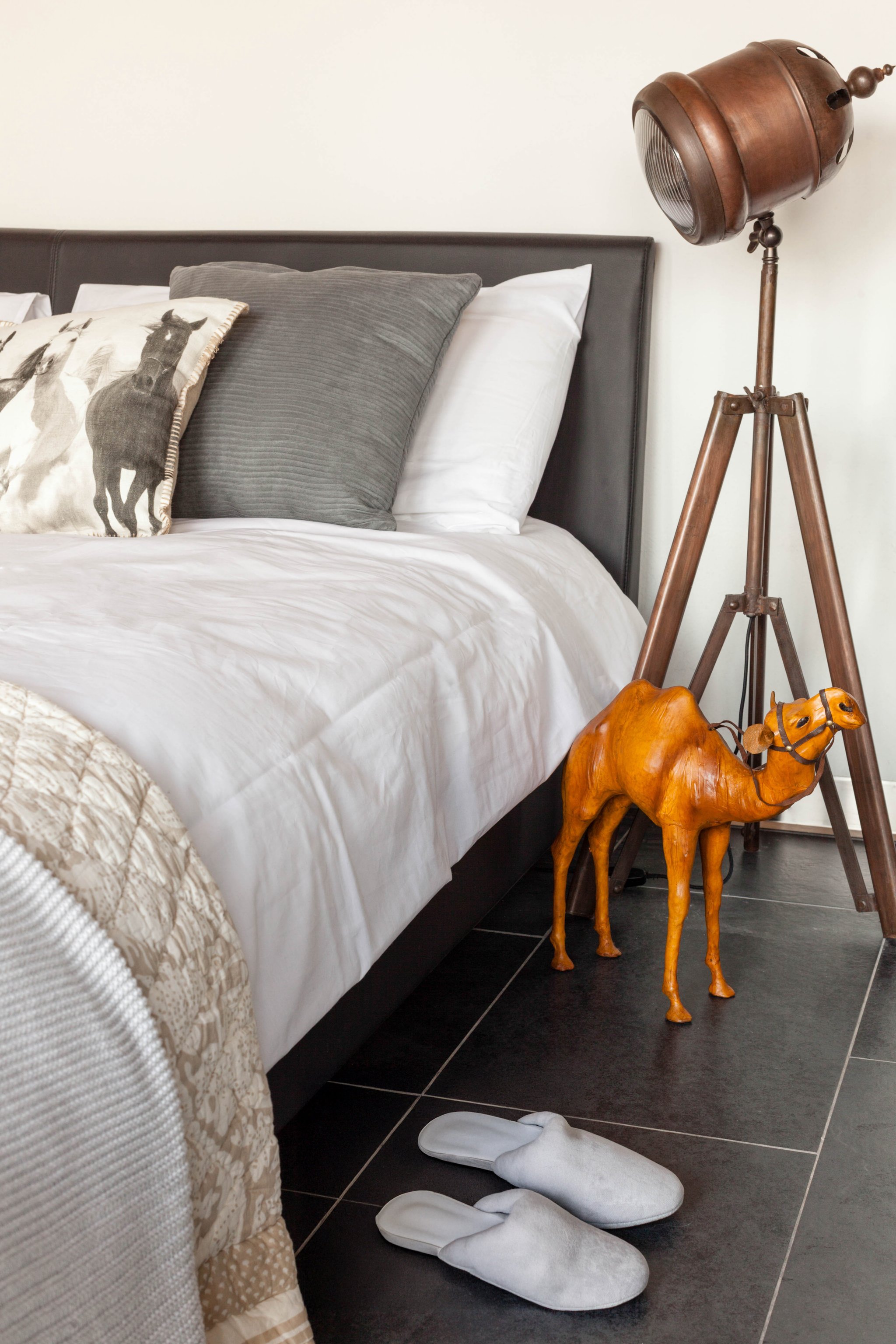 Las maderas cálidas, los textiles suaves y las piezas decorativas con carácter —como la lámpara de trípode de inspiración vintage o el camello tallado— aportan alma al conjunto. La luz natural tamizada por el juego de colores neutros y fibras naturales envuelve la habitación con una atmósfera envolvente y acogedora.