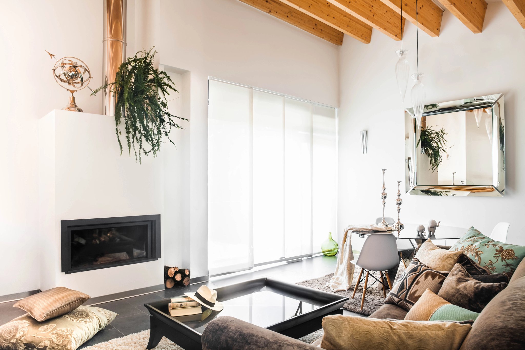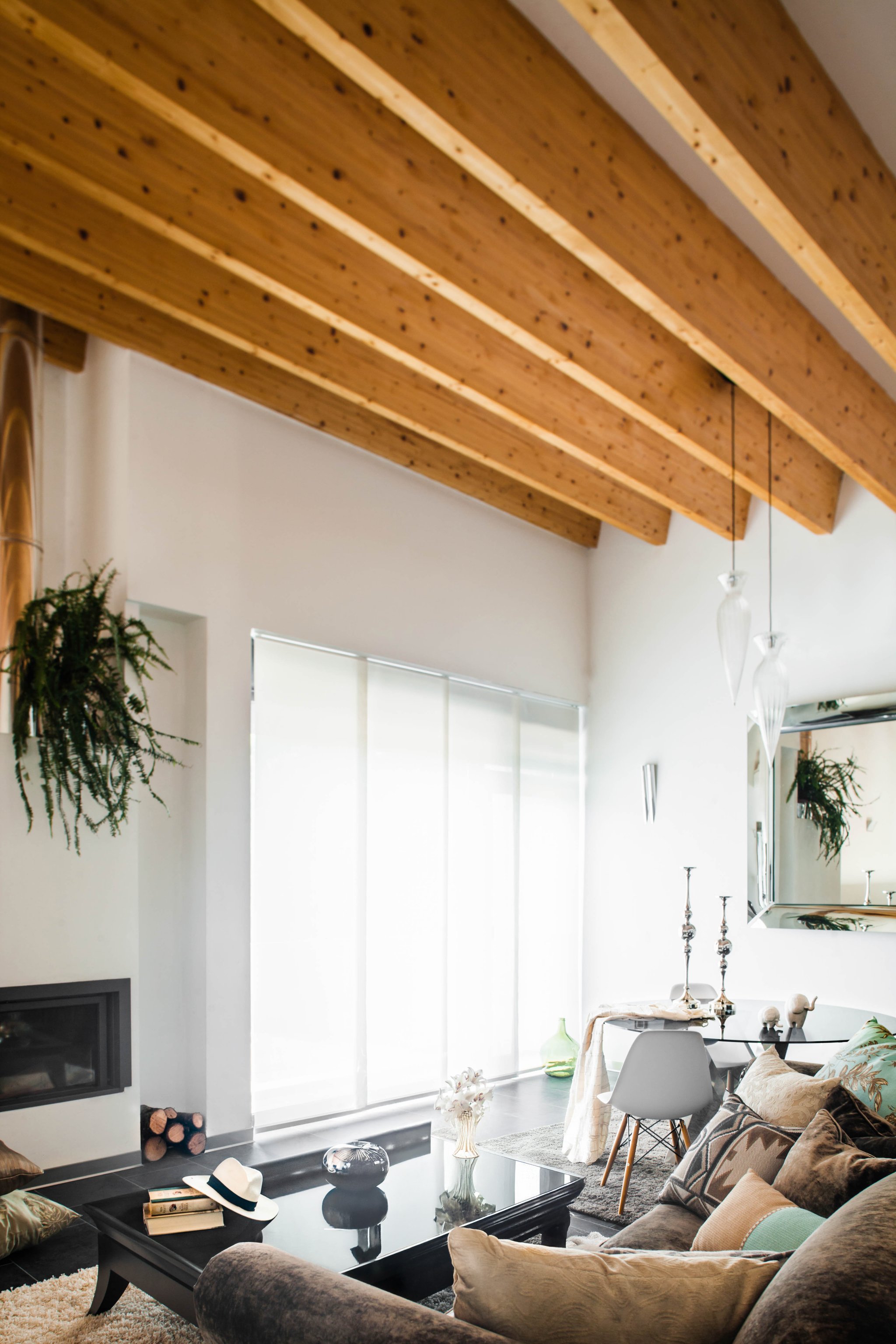 Las vigas de madera aportan verticalidad y calidez, mientras la luz natural baña sutilmente cada rincón, suavizando contornos y creando profundidad.
